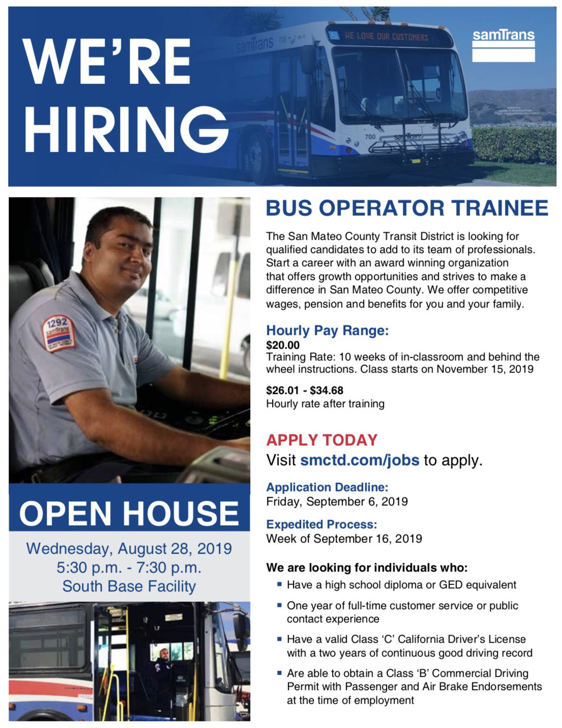 Samtrans On Twitter Samtrans Bus Operator Job Fair In Cityofsancarlos Samtrans Southbase Facility 501 Pico Blvd San Carlos Wed August 28th 5 30 Pm 7 30 Pm We Re Seeking Men Amp
